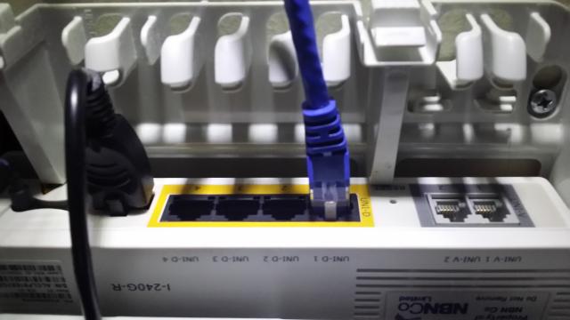 The blue cable connection shown here is to port 1 on my MikroTik and the green cable on port 2 goes to my network switch/hub When I connected my phone line to either of the UNI-V 1 or UNI-V 2 ports on the NBN wall unit I did not get any phone tone on the phone itself. What I did find, however, was if I left the phone line connected to the original Telstra supplied router and connected this router to my network switch/hub, I did get a fully operational phone.